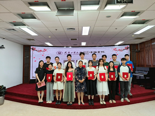 温朝驰同学代表子衿班学员发言,并向书院捐赠了他制作的鞠球作品和篆刻作品。子衿班班长王富增同学畅谈了在书院学习的经验和感想,号召结业学员要与书院保持联系,继续为书院建设作贡献。林东洪同学现场弹奏了一曲《酒狂》,国学汉服社的陈思佳和肖丹妮同学向师生介绍汉服及礼仪并现场演示汉服基本礼仪。仪式最后,在校合唱团陆离同学带领下,师生合唱天津工业大学校歌。