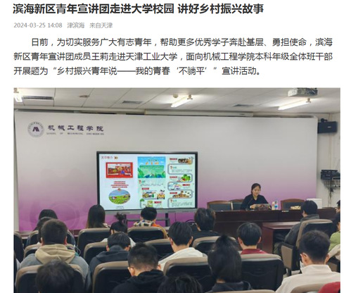 日前,为切实服务广大有志青年,帮助更多优秀学子奔赴基层、勇担使命,滨海新区青年宣讲团成员王莉走进天津工业大学,面向机械工程学院本科年级全体班干部开展题为“乡村振兴青年说——我的青春‘不躺平’”宣讲活动。
