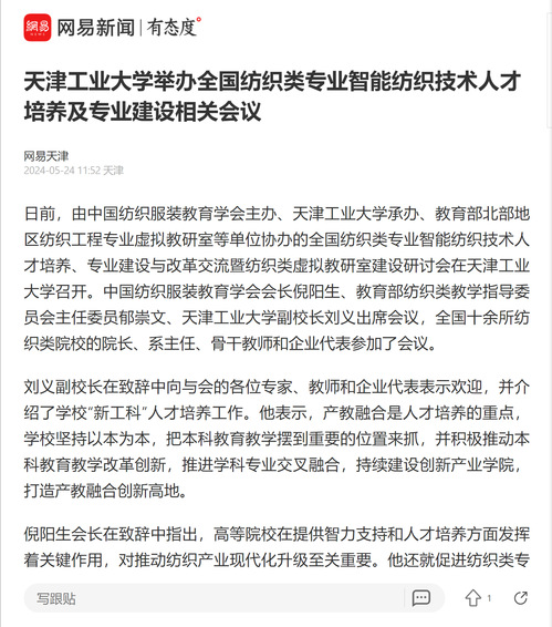 据悉,本次会议是全国范围内首次以智能纺织人才培养为主题、以为发展新质生产力提供人才与智力支撑为目标的纺织高校专业建设会议。会议在智能纺织人才培养、专业内涵建设等方面达成的共识,对于面向纺织产业创新发展升级人才链、优化人才生态链,面向未来纺织科技创新发展前瞻性部署人才链,具有重要的现实意义和战略影响。