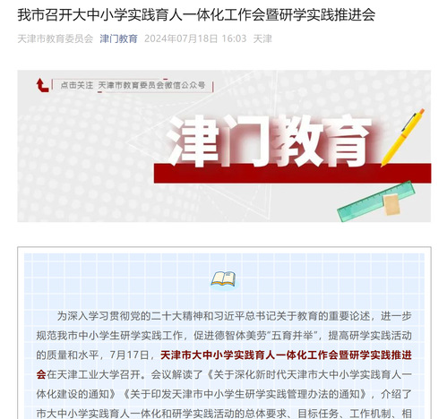 为深入学习贯彻党的二十大精神和习近平总书记关于教育的重要论述,进一步规范我市中小学生研学实践工作,促进德智体美劳“五育并举”,提高研学实践活动的质量和水平,7月17日,天津市大中小学实践育人一体化工作会暨研学实践推进会在天津工业大学召开。会议解读了《关于深化新时代天津市大中小学实践育人一体化建设的通知》《关于印发天津市中小学生研学实践管理办法的通知》,介绍了市大中小学实践育人一体化和研学实践活动的总体要求、目标任务、工作机制、相关要求。市委教育工委分管负责同志出席并讲话。