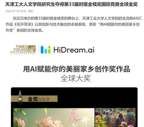 在近日举办的第33届时报金犊奖的舞台上,天津工业大学人文学院的全流程AIGC作品《花开菏泽》以其创新与技术融合的卓越表现,荣获“用AI赋能你的美丽家乡创作奖”类别的全球金奖。