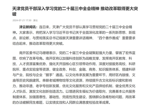 津云丨天津党员干部深入学习党的二十届三中全会精神 推动改革取得更大突破