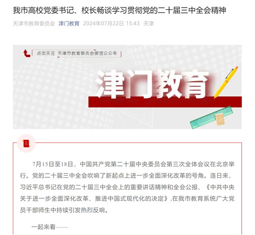 党的二十届三中全会高度评价了新时代以来全面深化改革的成功实践和伟大成就,对进一步全面深化改革做出系统部署。蓝图已绘就,奋斗正当时。学校党委将学习宣传贯彻全会精神作为当前和今后一个时期重大政治任务,深刻领会和把握进一步全面深化改革的主题、重大原则、重大举措、根本保证,结合落实习近平总书记视察天津重要讲话精神,聚焦立德树人根本任务,坚持守正创新,强化系统观念,聚焦我市高质量发展“十项行动”,持续深入实施学校“十大专项行动”,完善育人方式、办学模式、管理体制、保障机制等一系列改革举措,不断提高服务经济社会高质量发展的能力水平,为加快建设教育强国、健康中国作出新的贡献。