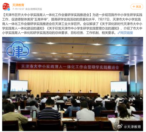 【天津市召开大中小学实践育人一体化工作会暨研学实践推进会】为进一步规范我市中小学生研学实践工作,促进德智体美劳“五育并举”,提高研学实践活动的质量和水平,7月17日,天津市大中小学实践育人一体化工作会暨研学实践推进会在天津工业大学召开。会议解读了《关于深化新时代天津市大中小学实践育人一体化建设的通知》《关于印发天津市中小学生研学实践管理办法的通知》,介绍了市大中小学实践育人一体化和研学实践活动的总体要求、目标任务、工作机制、相关要求。