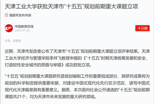近期,天津市发改委公布了天津市“十五五”规划前期重大课题立项评审结果。天津工业大学经济与管理学院李祥飞教授申报的《“十五五”时期天津统筹发展和安全、打造韧性安全城市的思路与举措》成功获批立项。
