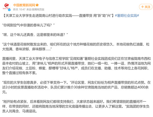 据了解,今年暑假,天津工业大学电子与信息工程学院“见微知著”暑期社会实践团跨越1464公里,来到甘肃省陇南市西和县开展暑期社会实践活动。实践团成员们用“津味儿”相声带货“甘味儿”特产,用“新”助“兴”,把课堂学习和乡村实践紧密结合起来,在推进中国式现代化的新征程上绽放青春光彩。
