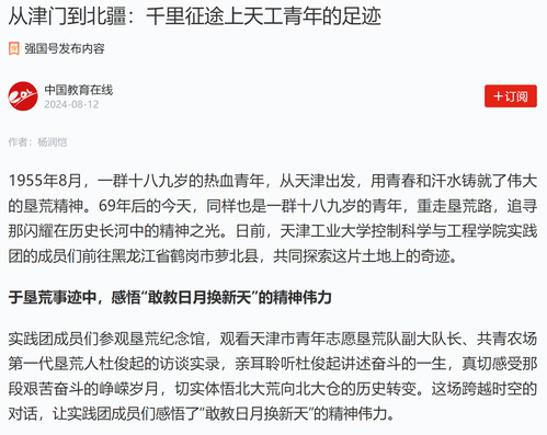 1955年8月,一群十八九岁的热血青年,从天津出发,用青春和汗水铸就了伟大的垦荒精神。69年后的今天,同样也是一群十八九岁的青年,重走垦荒路,追寻那闪耀在历史长河中的精神之光。日前,天津工业大学控制科学与工程学院实践团的成员们前往黑龙江省鹤岗市萝北县,共同探索这片土地上的奇迹。