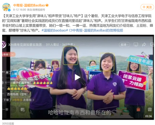 【天津工业大学学生用“津味儿”相声带货“甘味儿”特产】这个暑假,天津工业大学电子与信息工程学院的“见微知著”暑期社会实践团的成员们在直播间里说起“津味儿”相声。大学生们在甘肃省陇南市西和县丰收村的山坡上实景直播带货,她们一唱一和、一捧一逗,热情洋溢地为网友们介绍花椒、土豆粉、蜂蜜、醪糟等“甘味儿”特产。