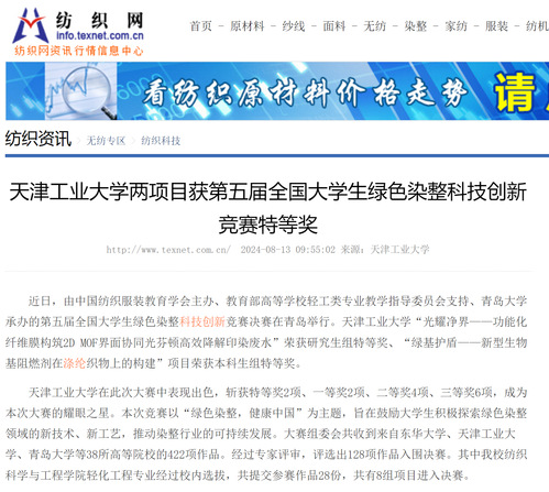 天津工业大学在此次大赛中表现出色,斩获特等奖2项、一等奖2项、二等奖4项、三等奖6项,成为本次大赛的耀眼之星。本次竞赛以“绿色染整,健康中国”为主题,旨在鼓励大学生积极探索绿色染整领域的新技术、新工艺,推动染整行业的可持续发展。大赛组委会共收到来自东华大学、天津工业大学、青岛大学等38所高等院校的422项作品。经过专家评审,评选出128项作品入围决赛。其中我校纺织科学与工程学院轻化工程专业经过校内选拔,共提交参赛作品28份,共有8组项目进入决赛。