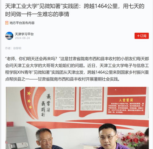 “老师,你们明天还会再来吗?”这是甘肃省陇南市西和县丰收村的小朋友们每天都会问天津工业大学的大哥哥大姐姐们的问题。近日,天津工业大学电子与信息工程学院XIN青年“见微知著”实践团从天津出发,跨越1464公里来到国家乡村振兴重点帮扶县之一——甘肃省陇南市西和县丰收村开展暑期社会实践。