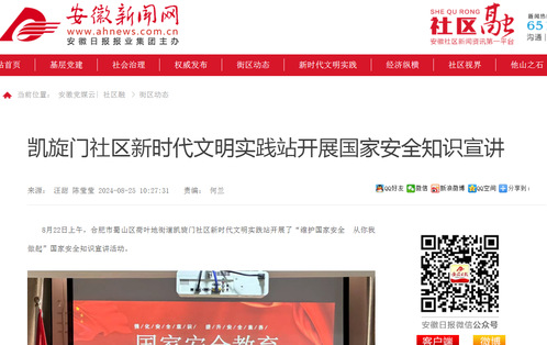 8月22日上午,合肥市蜀山区荷叶地街道凯旋门社区新时代文明实践站开展了“维护国家安全 从你我做起”国家安全知识宣讲活动。