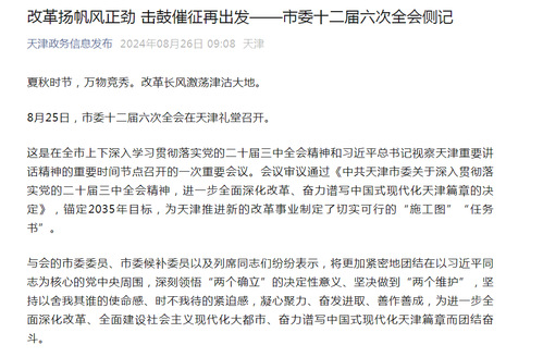 这是在全市上下深入学习贯彻落实党的二十届三中全会精神和习近平总书记视察天津重要讲话精神的重要时间节点召开的一次重要会议。会议审议通过《中共天津市委关于深入贯彻落实党的二十届三中全会精神,进一步全面深化改革、奋力谱写中国式现代化天津篇章的决定》,锚定2035年目标,为天津推进新的改革事业制定了切实可行的“施工图”“任务书”。