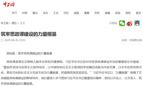 思政课是落实立德树人根本任务的关键课程。习近平总书记在对学校思政课建设作出的重要指示中强调:“要始终坚持马克思主义指导地位,以中国特色社会主义取得的举世瞩目成就为内容支撑,以中华优秀传统文化、革命文化和社会主义先进文化为力量根基,把道理讲深讲透讲活。”习近平总书记以“力量根基”明确了文化赋能思政课建设的鲜明导向,我们要深入学习贯彻习近平总书记重要指示精神,坚持以文化人、以文育人,筑牢思政课建设的力量根基。