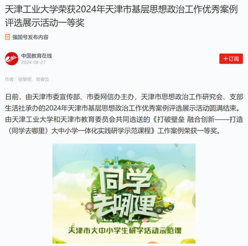 日前,由天津市委宣传部、市委网信办主办,天津市思想政治工作研究会、支部生活社承办的2024年天津市基层思想政治工作优秀案例评选展示活动圆满结束。由天津工业大学和天津市教育委员会共同选送的《打破壁垒 融合创新——打造〈同学去哪里〉大中小学一体化实践研学示范课程》工作案例荣获一等奖。
