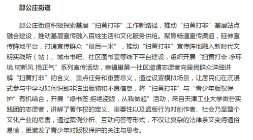 邵公庄街道积极探索基层“扫黄打非”工作新路径,推动“扫黄打非”基层站点融合建设,推动基层宣传融入百姓生活和文化服务供给。聚焦畅通宣传渠道,延伸宣传阵地平台,打通宣传群众“最后一米”,推动“扫黄打非”宣传阵地融入新时代文明实践所(站)、城市书吧、社区图书室等线下平台建设,组织开展“扫黄打非 净环境 树新风 扬正气”系列宣传活动,幸福里第一社区邀请志愿者向居民群众详细讲解“扫黄打非”的含义、重点任务和重要意义,通过设置模拟场景,让居民们在沉浸式参与中学习如何识别非法出版物和不良信息,将“扫黄打非”与“青少年版权保护”有机结合,开展“绿书签·拒绝盗版,从我做起”活动,来自天津工业大学微芒实践团的志愿者,讲解了著作权的定义、重要性以及盗版行为对创作者、社会乃至整个文化产业的危害,通过案例分析、互动问答等形式,不仅让复杂的法律条文变得通俗易懂,更激发了青少年对版权保护的关注与思考。