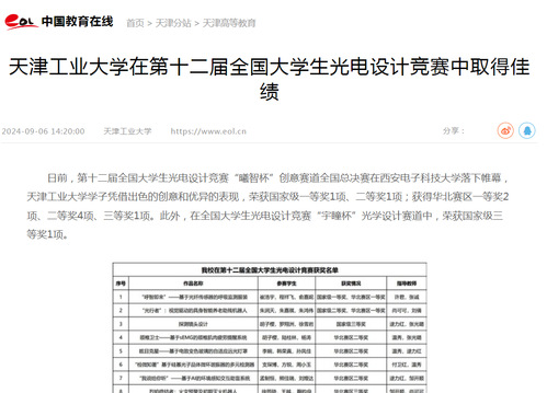 日前,第十二届全国大学生光电设计竞赛“曦智杯”创意赛道全国总决赛在西安电子科技大学落下帷幕,天津工业大学学子凭借出色的创意和优异的表现,荣获国家级一等奖1项、二等奖1项;获得华北赛区一等奖2项、二等奖4项、三等奖1项。此外,在全国大学生光电设计竞赛“宇瞳杯”光学设计赛道中,荣获国家级三等奖1项。