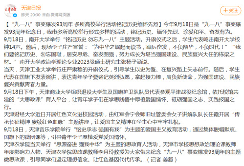 【“九一八”事变爆发93周年 多所高校举行活动铭记历史缅怀先烈】今年9月18日是“九一八”事变爆发93周年纪念日,我市多所高校举行形式多样的活动,铭记历史、缅怀先烈、珍爱和平、奋发有为。