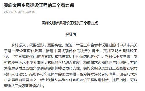 乡村振兴,既要塑形,更要铸魂。党的二十届三中全会审议通过的《中共中央关于进一步全面深化改革、推进中国式现代化的决定》提出,实施文明乡风建设工程。“中国式现代化是物质文明和精神文明相协调的现代化”。新时代十多年来,农村物质生活水平显著改善,农民群众的综合素质、精神追求必然也要与时俱进,方能为推进乡村全面振兴提供足够的精神动力和支撑。实施文明乡风建设工程是加强农村精神文明建设、推动乡村文化振兴的重要举措,也对持续深化农村改革、促进现代乡村发展具有重要意义。新时代推动实施文明乡风建设工程改进创新、提质增速,可以着重从三大方面持续发力。