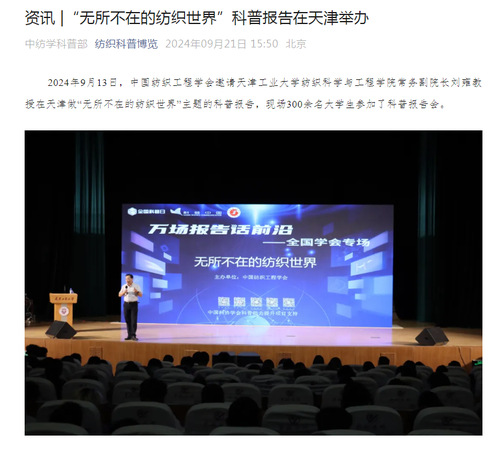 2024年9月13日,中国纺织工程学会邀请天津工业大学纺织科学与工程学院常务副院长刘雍教授在天津做“无所不在的纺织世界”主题的科普报告,现场300余名大学生参加了科普报告会。