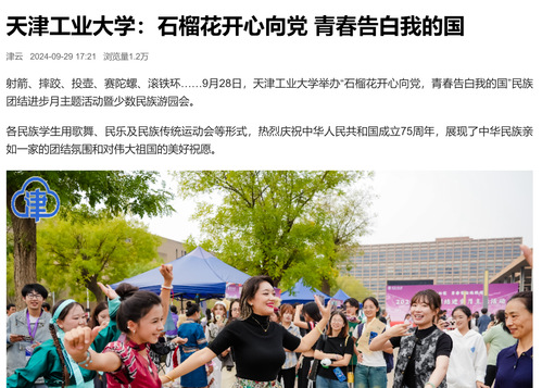 天津工业大学:石榴花开心向党 青春告白我的国射箭、摔跤、投壶、赛陀螺、滚铁环……9月28日,天津工业大学举办“石榴花开心向党,青春告白我的国”民族团结进步月主题活动暨少数民族游园会。各民族学生用歌舞、民乐及民族传统运动会等形式,热烈庆祝中华人民共和国成立75周年,展现了中华民族亲如一家的团结氛围和对伟大祖国的美好祝愿。