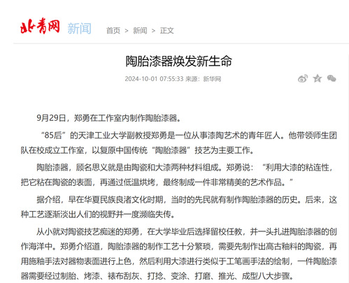 “85后”的天津工业大学副教授郑勇是一位从事漆陶艺术的青年匠人。他带领师生团队在校成立工作室,以复原中国传统“陶胎漆器”技艺为主要工作。