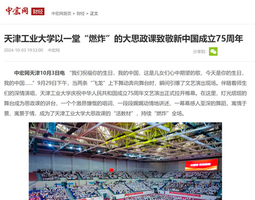 中宏网天津10月3日电 “我们祝福你的生日,我的中国,这是儿女们心中期望的歌,今天是你的生日,我的中国……”9月29日下午,当两条“飞龙”上下舞动奔向舞台时,瞬间引爆了文艺演出现场。伴随着师生们的深情演唱,天津工业大学庆祝中华人民共和国成立75周年文艺演出正式拉开帷幕。在这里,灯光熠熠的舞台成为思政课的讲台,一个个激昂慷慨的唱词、一段段娓娓动情地讲述、一幕幕感人至深的舞蹈,寓情于景、寓景于情,成为了天津工业大学大思政课的“活教材”,持续“燃炸”全场。