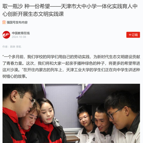 “一个多月前,我们学校的同学们用自己的劳动实践,为新时代生态文明建设贡献了青春力量。这次,我们将和大家一起亲手播种绿色的种子,将更多的希望带进这片沙漠。”在开往内蒙古的列车上,天津工业大学的学生们正在向中学生讲述种树植心的故事。