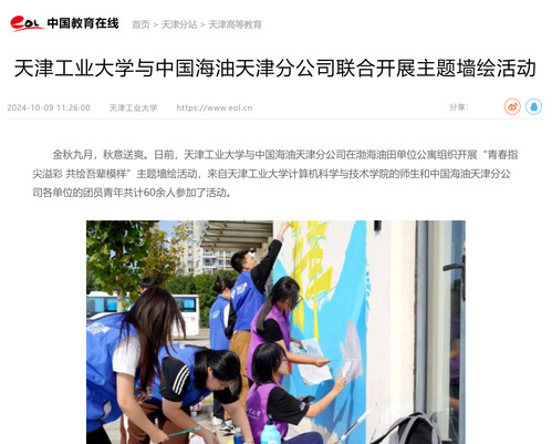 金秋九月,秋意送爽。日前,天津工业大学与中国海油天津分公司在渤海油田单位公寓组织开展“青春指尖溢彩 共绘吾辈模样”主题墙绘活动,来自天津工业大学计算机科学与技术学院的师生和中国海油天津分公司各单位的团员青年共计60余人参加了活动。