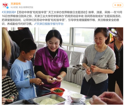 #天津新闻#【劳动中体悟“粒粒皆辛苦” 天工大举办世界粮食日主题活动】除草、浇灌、采摘……在10月16日世界粮食日到来之际,天津工业大学药学院举办“药苑劳动迎丰收 田间思政助成长”主题实践活动,把课堂搬到田间,让同学们在劳动中体悟“粒粒皆辛苦”,引导学生增强爱粮节粮、关注粮食安全的意识,养成勤俭节约好习惯。