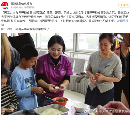 【天工大举办世界粮食日主题活动】除草、浇灌、采摘……在10月16日世界粮食日到来之际,天津工业大学药学院举办“药苑劳动迎丰收 田间思政助成长”主题实践活动,把课堂搬到田间,让同学们在劳动中体悟“粒粒皆辛苦”,引导学生增强爱粮节粮、关注粮食安全的意识,养成勤俭节约好习惯。
