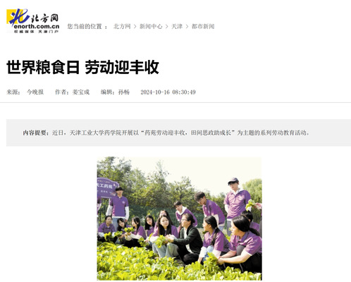 世界粮食日 劳动迎丰收天津北方网讯:今天是世界粮食日。近日,天津工业大学药学院开展以“药苑劳动迎丰收,田间思政助成长”为主题的系列劳动教育活动,学生们采摘自己种植的蔬菜,在团结协作间乐享劳动成果。(津云新闻编辑孙畅)