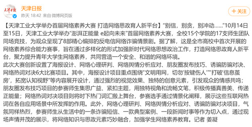 【天津工业大学举办首届网络素养大赛 打造网络思政育人新平台】“别信,别贪,别冲动……”10月14日至15日,天津工业大学举办“澎湃正能量 e起向未来”首届网络素养大赛,全校15个学院的17支师生团队同场竞技,为观众呈现了8部精心编排的反电信网络诈骗情景剧。据了解,这是全市高校中首次开展的网络素养综合能力赛事,旨在通过多样化的形式加强新时代网络思想政治工作,打造网络思政育人新平台,聚力提升青年大学生网络素养,共同营造一个安全、和谐的网络环境。