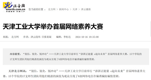 天津北方网讯:“别信,别贪,别冲动”……天津工业大学日前举行“澎湃正能量 e起向未来”首届网络素养大赛,15个学院的17支师生团队用他们精湛的演技为观众呈现了8部网络电信诈骗诱骗防骗情景剧。