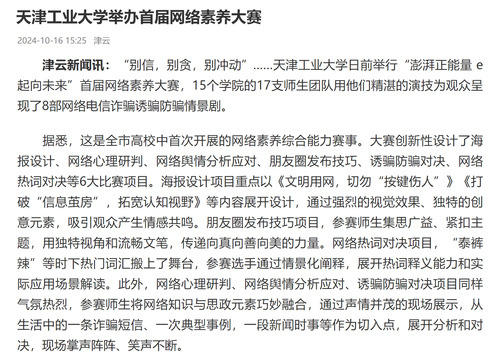 大赛突出以赛代练、以赛代训,强化以赛促学、以赛促建。天津工业大学相关负责人表示,天津工大将持续把网络素养大赛作为加强和改进学校网络思想政治工作的重要抓手,唱响新时代网络文明教育工作主旋律,助力网络思想政治工作实现内涵式高质量发展。