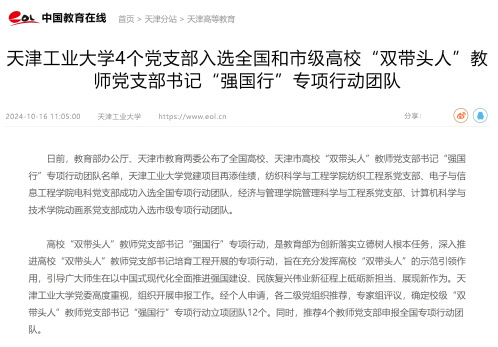 日前,教育部办公厅、天津市教育两委公布了全国高校、天津市高校“双带头人”教师党支部书记“强国行”专项行动团队名单,天津工业大学党建项目再添佳绩,纺织科学与工程学院纺织工程系党支部、电子与信息工程学院电科党支部成功入选全国专项行动团队,经济与管理学院管理科学与工程系党支部、计算机科学与技术学院动画系党支部成功入选市级专项行动团队。