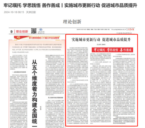 作为城市永续发展的自我调节机制,城市更新是推动城市高质量发展的重要手段。党的二十大报告指出,“提高城市规划、建设、治理水平,加快转变超大特大城市发展方式,实施城市更新行动,加强城市基础设施建设,打造宜居、韧性、智慧城市”。《中华人民共和国国民经济和社会发展第十四个五年规划和2035年远景目标纲要》提出,“加快转变城市发展方式,统筹城市规划建设管理,实施城市更新行动,推动城市空间结构优化和品质提升”。习近平总书记视察天津时强调,天津要坚持走内涵式发展路子,创新城市治理,加强韧性安全城市建设,积极实施城市更新行动,增强发展潜力、优化发展空间,推动城市业态、功能、品质不断提升。人民城市人民建,人民城市为人民。新时代新征程,我们必须始终坚持以人民为中心的发展思想,扎实推进城市更新各项工作,通过城市更新提升城市品质内涵,更好造福广大人民群众。