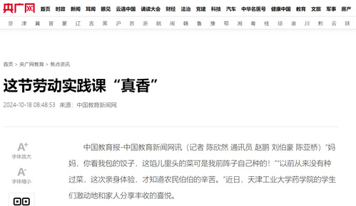 中国教育报-中国教育新闻网讯(记者 陈欣然 通讯员 赵鹏 刘伯豪 陈亚桥)“妈妈,你看我包的饺子,这馅儿里头的菜可是我前阵子自己种的!”“以前从来没有种过菜,这次亲身体验,才知道农民伯伯的辛苦。”近日,天津工业大学药学院的学生们激动地和家人分享丰收的喜悦。