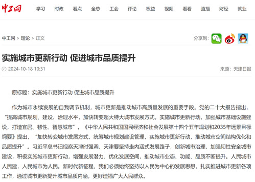 作为城市永续发展的自我调节机制,城市更新是推动城市高质量发展的重要手段。党的二十大报告指出,“提高城市规划、建设、治理水平,加快转变超大特大城市发展方式,实施城市更新行动,加强城市基础设施建设,打造宜居、韧性、智慧城市”。《中华人民共和国国民经济和社会发展第十四个五年规划和2035年远景目标纲要》提出,“加快转变城市发展方式,统筹城市规划建设管理,实施城市更新行动,推动城市空间结构优化和品质提升”。习近平总书记视察天津时强调,天津要坚持走内涵式发展路子,创新城市治理,加强韧性安全城市建设,积极实施城市更新行动,增强发展潜力、优化发展空间,推动城市业态、功能、品质不断提升。人民城市人民建,人民城市为人民。新时代新征程,我们必须始终坚持以人民为中心的发展思想,扎实推进城市更新各项工作,通过城市更新提升城市品质内涵,更好造福广大人民群众。