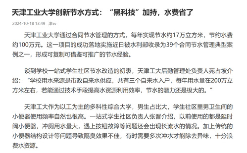 天津工业大学通过合同节水管理的方式,每年实现节水约17万立方米,节约水费约100万元。这一项目的成功落地实施近日被水利部收录为39个合同节水管理典型案例之一,形成可复制可借鉴可推广的节水经验。