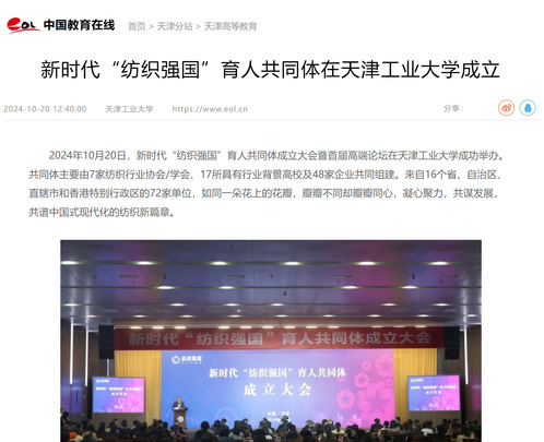 2024年10月20日,新时代“纺织强国”育人共同体成立大会暨首届高端论坛在天津工业大学成功举办。共同体主要由7家纺织行业协会/学会、17所具有行业背景高校及48家企业共同组建。来自16个省、自治区、直辖市和香港特别行政区的72家单位,如同一朵花上的花瓣,瓣瓣不同却瓣瓣同心,凝心聚力,共谋发展,共谱中国式现代化的纺织新篇章。