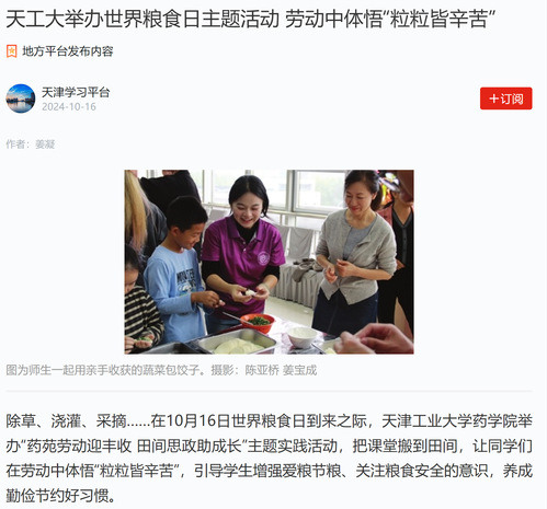 除草、浇灌、采摘……在10月16日世界粮食日到来之际,天津工业大学药学院举办“药苑劳动迎丰收 田间思政助成长”主题实践活动,把课堂搬到田间,让同学们在劳动中体悟“粒粒皆辛苦”,引导学生增强爱粮节粮、关注粮食安全的意识,养成勤俭节约好习惯。