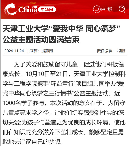 为了关爱和鼓励留守儿童,促进他们积极健康成长,10月10日至21日,天津工业大学控制科学与工程学院携手“环益童行”项目组共同举办“爱我中华同心筑梦之三行情书”公益主题活动,近1000名学子参与,本次活动的意义在于,为留守儿童点亮求学之径,让他们切实感受到社会的深切关爱;为孩子们营造更为优良的成长环境,使他们在知识的充分滋养下茁壮成长,能够坚定且勇敢地去追逐自己的梦想。