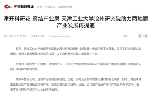在沧州工苑的生产车间里,公司创始人、天津工业大学教授李振环正在指导学生检验低膜阻低渗氢聚苯硫醚纤维隔膜的制备效果。v