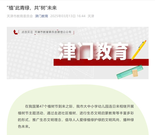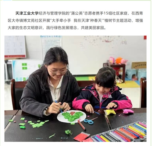 “植”此青绿,共“树”未来在我国第47个植树节到来之际,我市大中小学幼儿园连日来相继开展植树节主题活动,通过走进社区植树、进行生态文明启蒙教育等丰富多彩的形式,推广生态文明理念,倡导人人爱绿植绿护绿的文明风尚,播种绿色未来。下面,就和教育小津一起走进生机盎然的春天吧——天津工业大学经济与管理学院的“蒲公英”志愿者携手15组社区家庭,在西青区大寺镇博文苑社区开展“大手牵小手 我在天津‘种春天’”植树节主题活动,增强大家的生态文明意识,践行绿色发展理念,共建美丽家园。