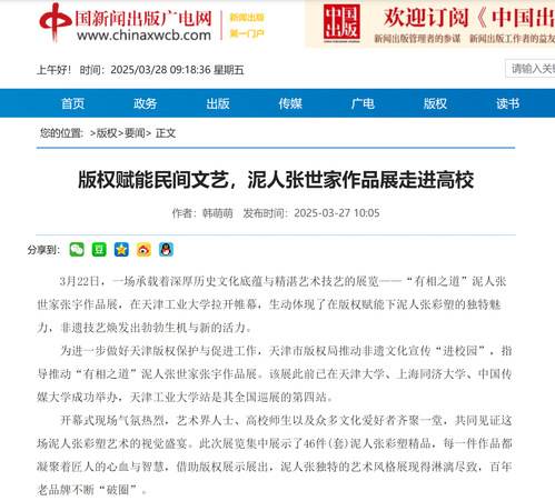 3月22日,一场承载着深厚历史文化底蕴与精湛艺术技艺的展览——“有相之道”泥人张世家张宇作品展,在天津工业大学拉开帷幕,生动体现了在版权赋能下泥人张彩塑的独特魅力,非遗技艺焕发出勃勃生机与新的活力。