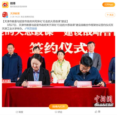 3月27日,天津市教委与延安市政府关于深化“行走的大思政课”建设战略合作框架协议签约仪式在天津工业大学举办。