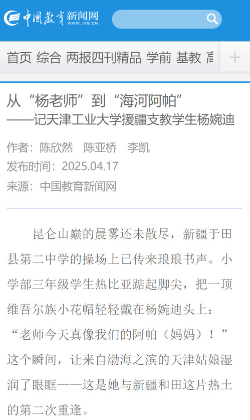 昆仑山巅的晨雾还未散尽,新疆于田县第二中学的操场上已传来琅琅书声。小学部三年级学生热比亚踮起脚尖,把一顶维吾尔族小花帽轻轻戴在杨婉迪头上:“老师今天真像我们的阿帕(妈妈)!”这个瞬间,让来自渤海之滨的天津姑娘湿润了眼眶——这是她与新疆和田这片热土的第二次重逢。