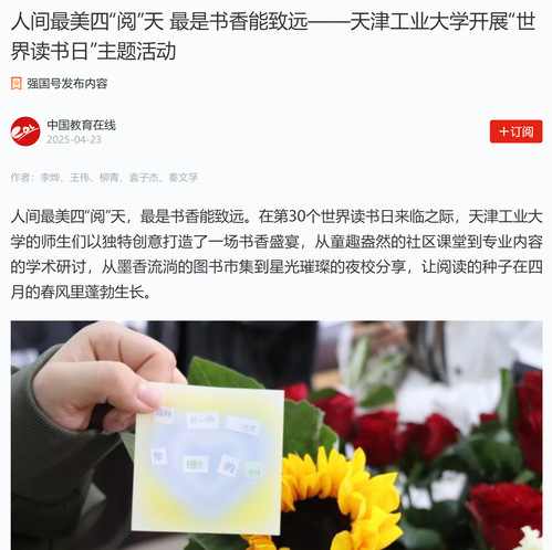 人间最美四“阅”天,最是书香能致远。在第30个世界读书日来临之际,天津工业大学的师生们以独特创意打造了一场书香盛宴,从童趣盎然的社区课堂到专业内容的学术研讨,从墨香流淌的图书市集到星光璀璨的夜校分享,让阅读的种子在四月的春风里蓬勃生长。