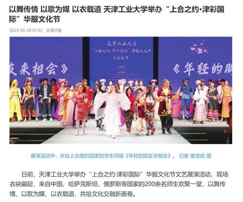 日前,天津工业大学举办“上合之约·津彩国际”华服文化节文艺展演活动,现场衣袂翩跹,来自中国、哈萨克斯坦、俄罗斯等国家的200余名师生欢聚一堂,以舞传情、以歌为媒、以衣载道,共绘文化交融新画卷。