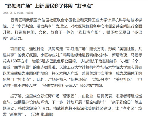 西青区精武镇国兴佳园社区联合小区物业和天津工业大学计算机科学与技术学院,以“多元共治、活力共享”为理念,对社区党群服务中心南侧公共空间进行全面升级,打造集休闲、文化、教育于一体的“彩虹湾广场”,赋予社区夏日“多巴胺”新活力。